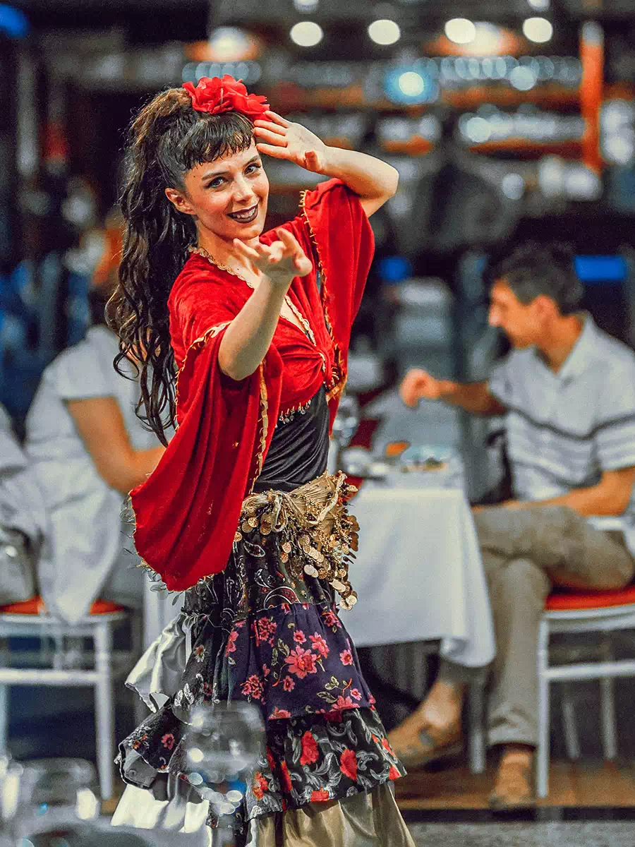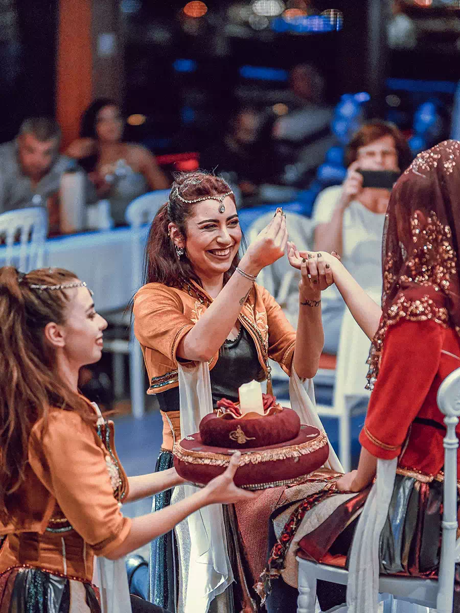 After dinner, you can enjoy the entertainment provided by professional teams. Whirling Dervish, Turkish Gypsy Dance, Caucasian Dance, Belly Dancer Group Show, Turkish Folk Dance, Belly Dancer, and more.